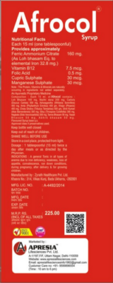 Apresia Lifesciences presents delicious orange flavoured Afrocol Syrup for low haemoglobin level and anaemia. Maintain the ideal level of iron to combat exhaustion and weakness. Each 5ml contains Ferrous Ascorbate and Folic Acid to produce healthy red blood cells. A complete family tonic which keeps you energized all day long by boosting iron deficiency and Immunity. Helps in enhancing concentration in your day to day work and restores sleep.